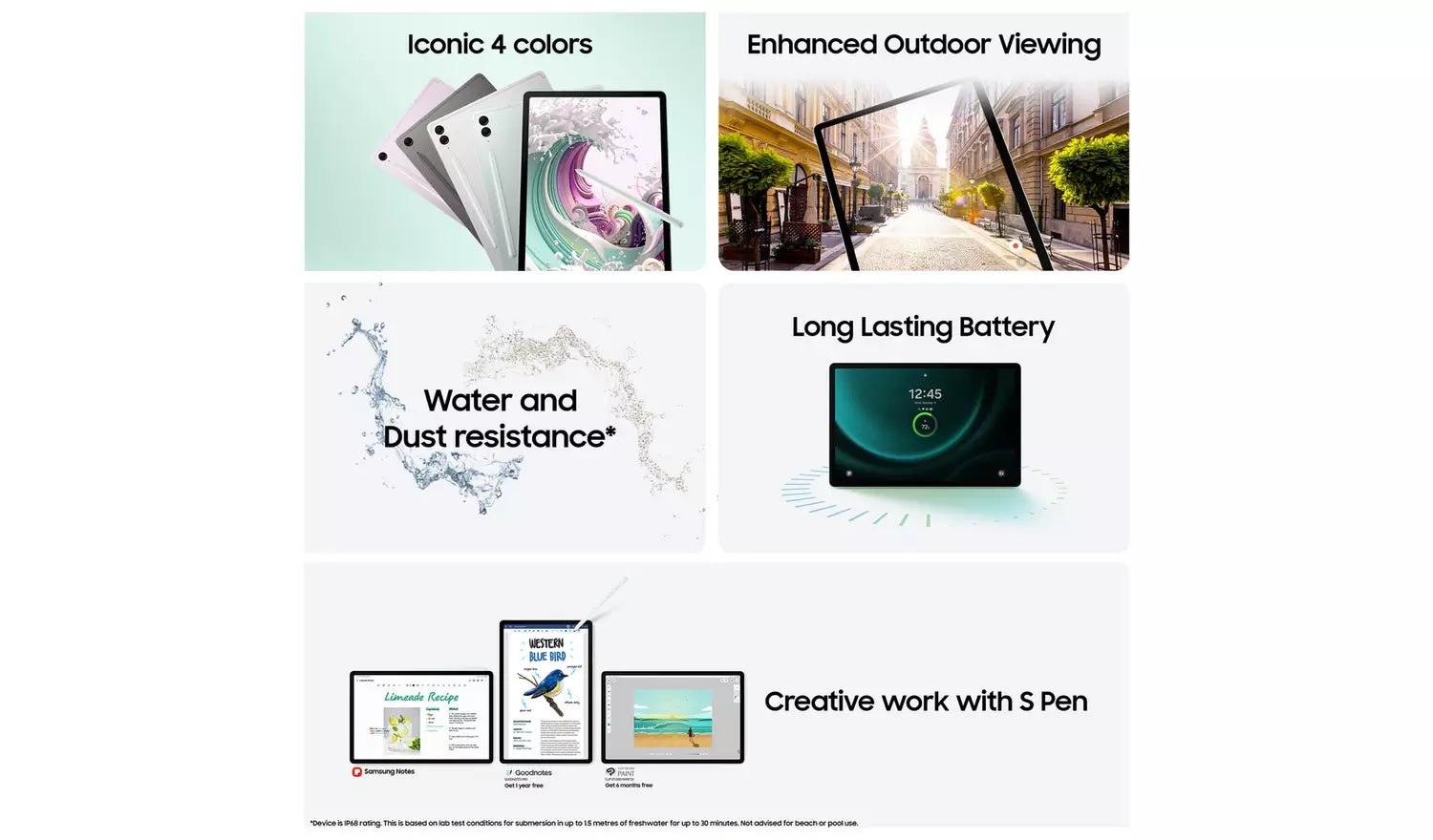 Built to handle everyday challenges, the Tab S9 FE is IP68-rated, offering protection against water and dust—making it safe to use on the go, rain or shine. -